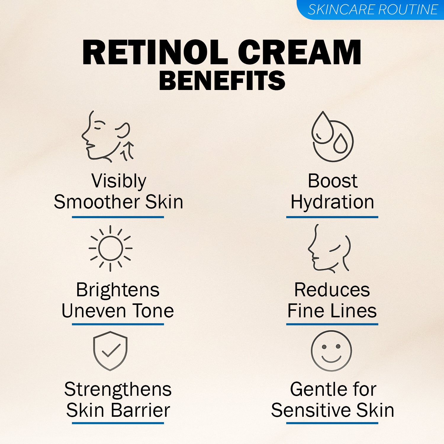 - Apply a small amount of RETINOL CREAM to cleansed face and neck in upward circular motions. For best results, use daily, morning, and evening.