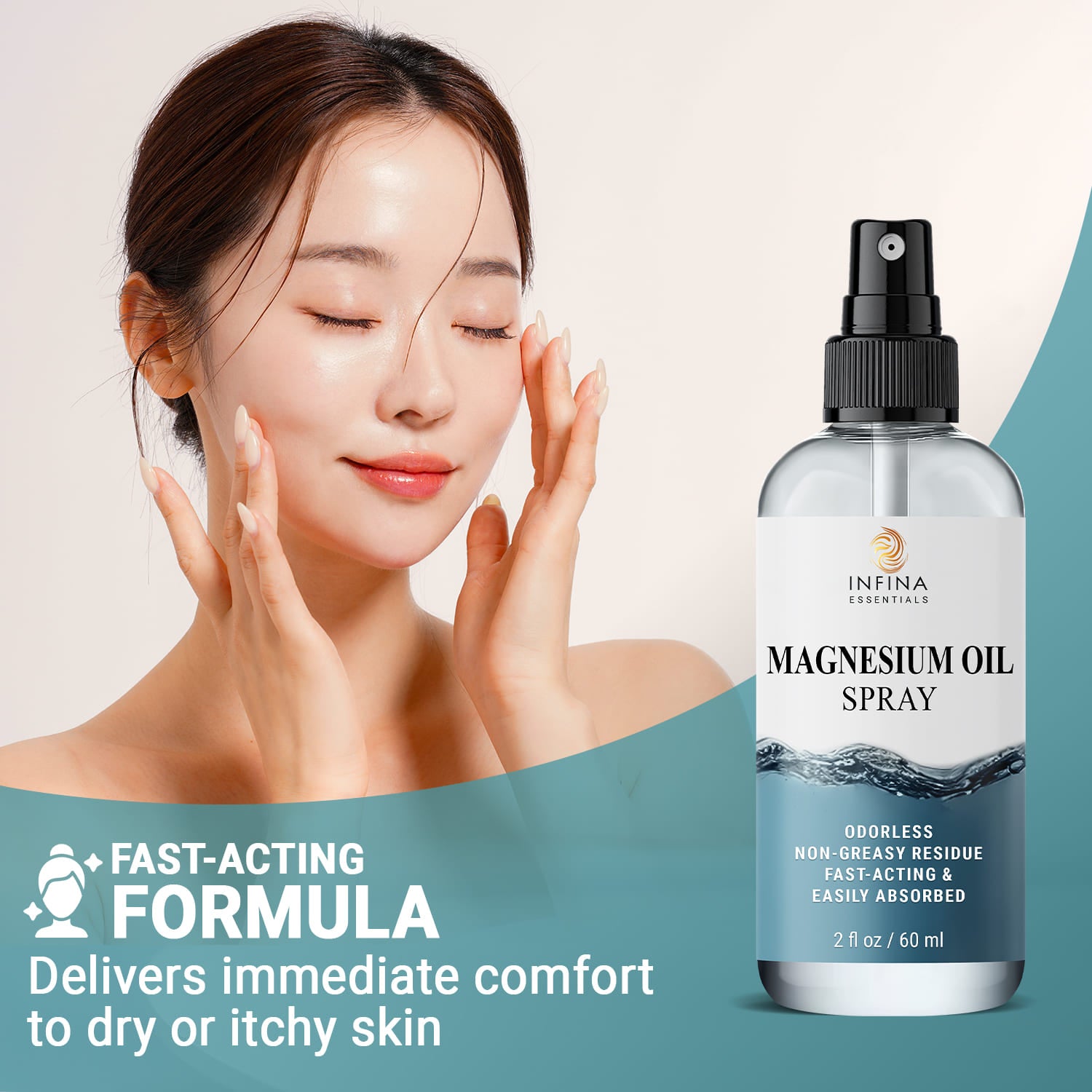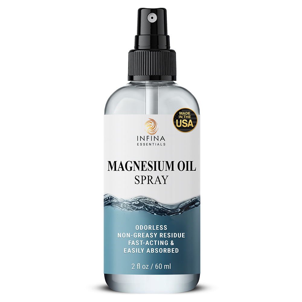 - Spray 3-5 pumps of INFINA ESSENTIALS Magnesium Oil Spray directly onto clean skin.