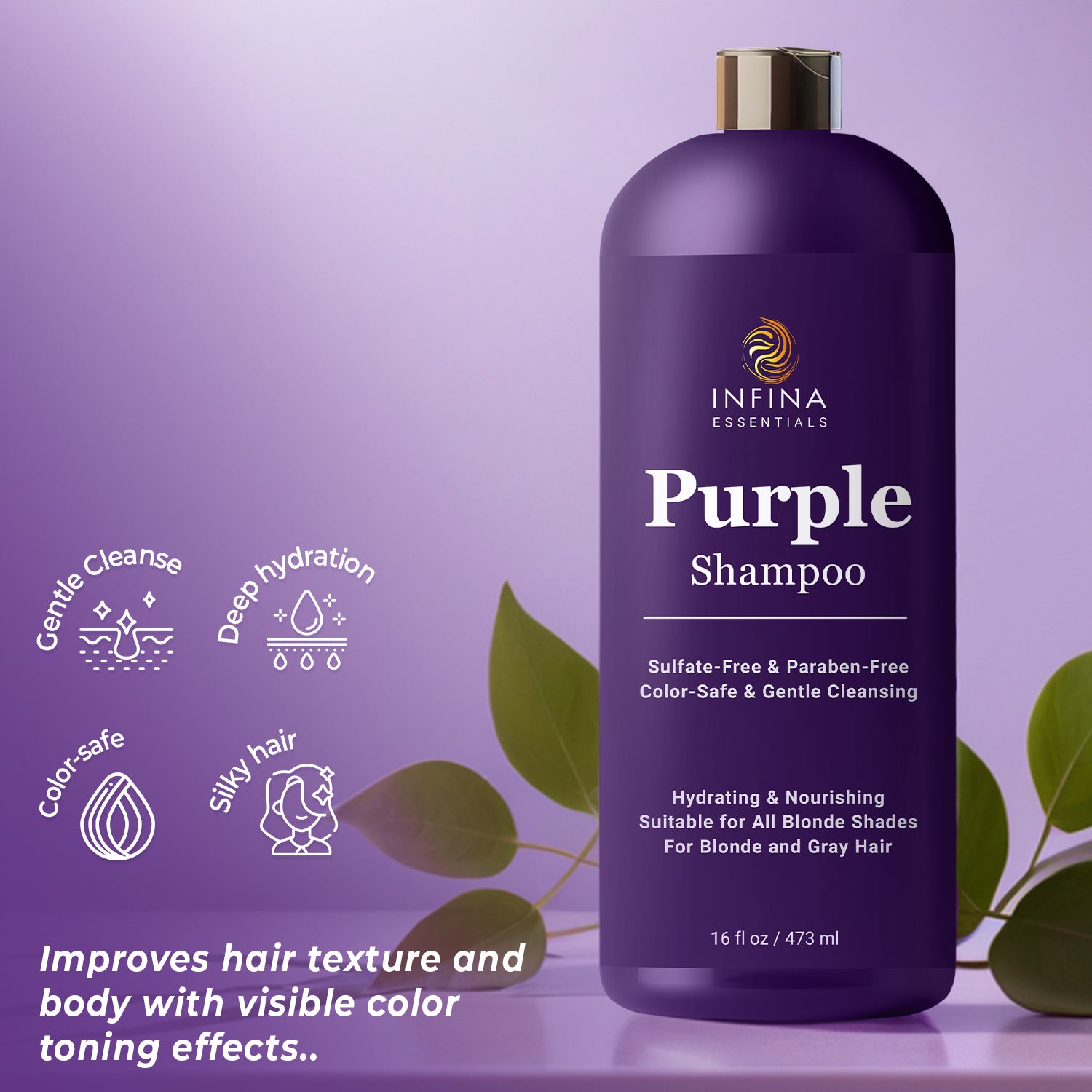 Revitalize your blonde or gray hair with Infina Essentials Purple Shampoo, meticulously crafted to combat brassiness and restore your hair's natural radiance. Infused nourishing ingredients for strong and healthy hair.