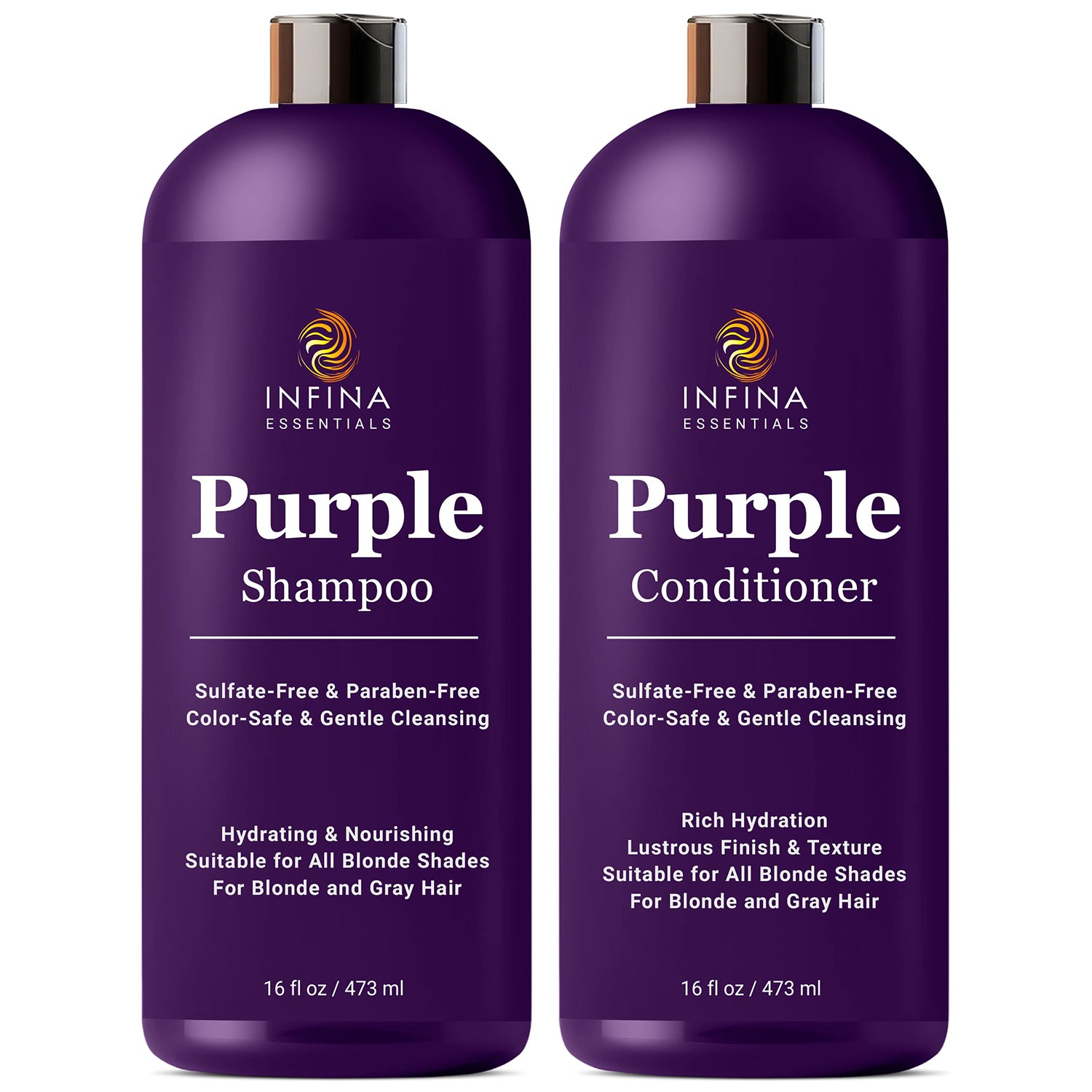 Revitalize your blonde or gray hair with the Infina Essentials Purple Shampoo and Conditioner Set, meticulously crafted to combat brassiness and restore your hair's natural radiance. Infused with nourishing ingredients for strong and healthy hair, this set is designed to keep your locks vibrant and glossy.